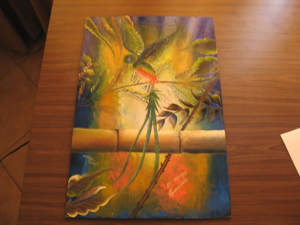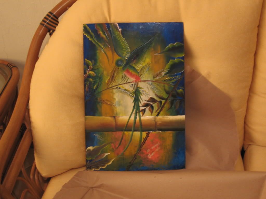 Here is a pic of the quetzal bird. I think I want to get a few more for the baby's room, maybe a quetzal bird themed nursery. Very beautiful. There were so many to choose from, i could have bought 3 or 4 more but was out of moolah.