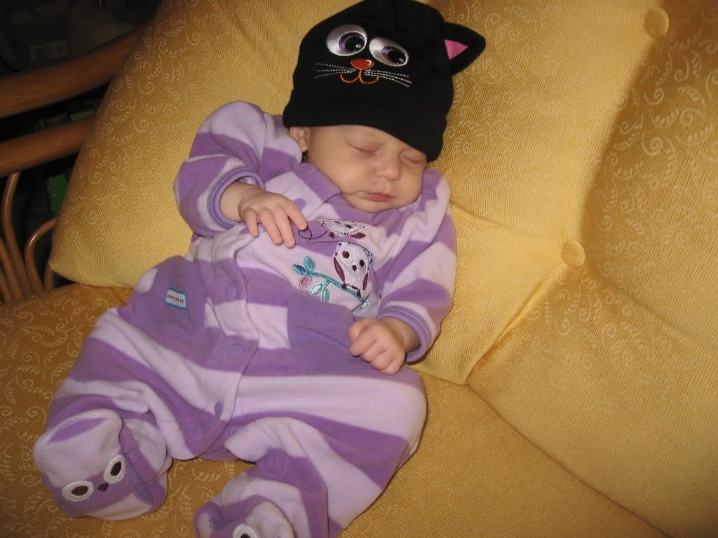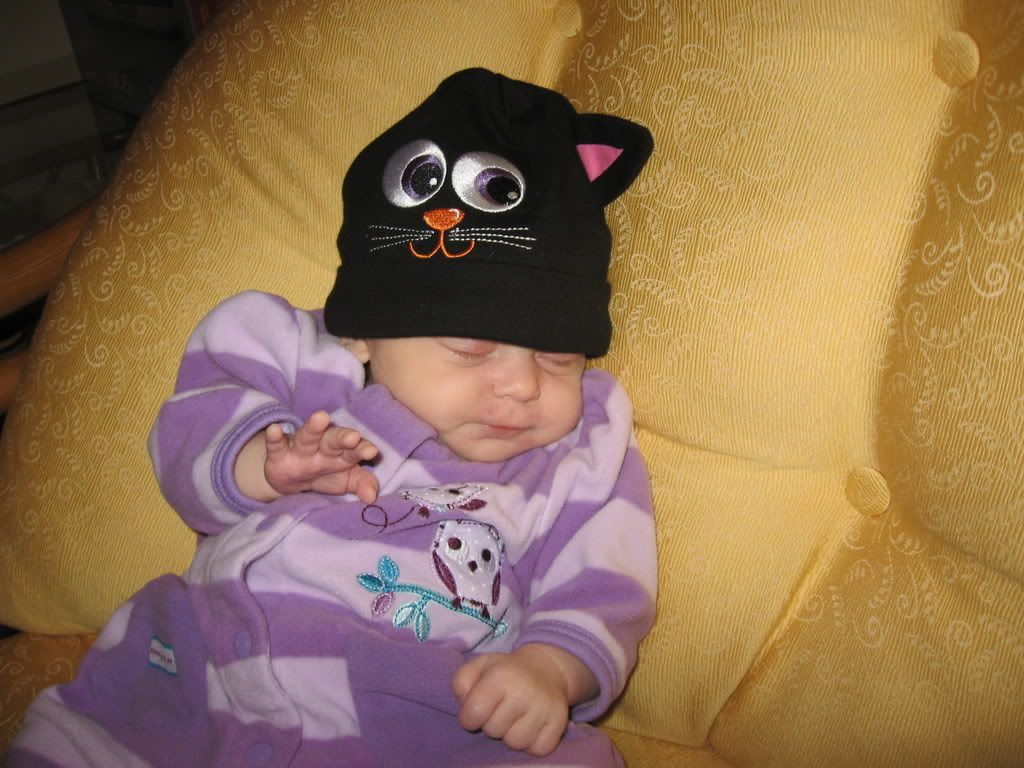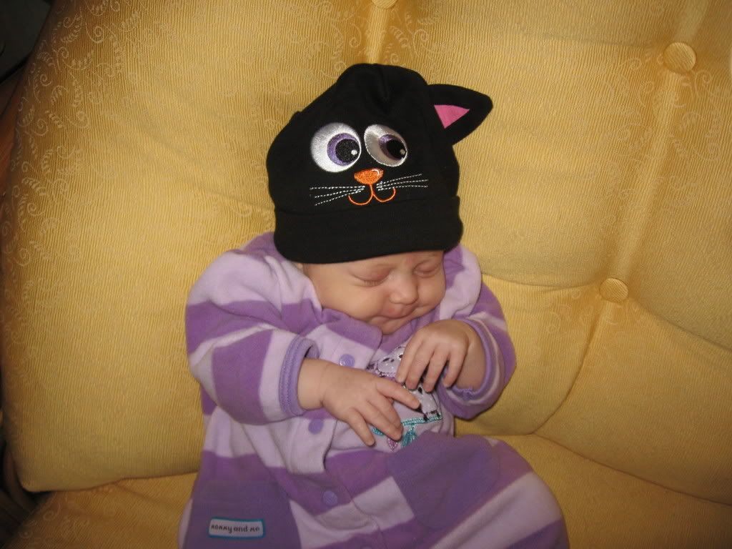 The hat was a bit big, but maybe next year. It kept sliding over her eyes or off her head. It also turned to the side so the eyeballs were in the wrong spot but cute nonetheless.