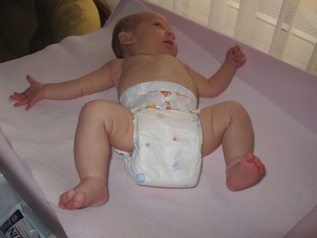 Today we tried small diapers and they fit! A little big in the leg but as long as they don't blow out, I can start using them. Here are some pics how she looks.