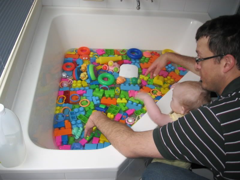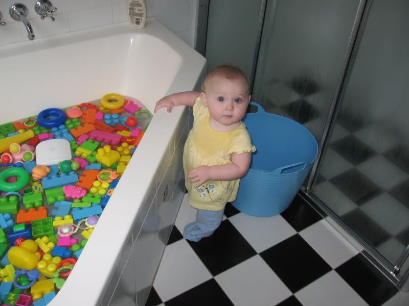 She was not too pleased to see all her toys in the tub. Wasn't sure if they would come back or not...