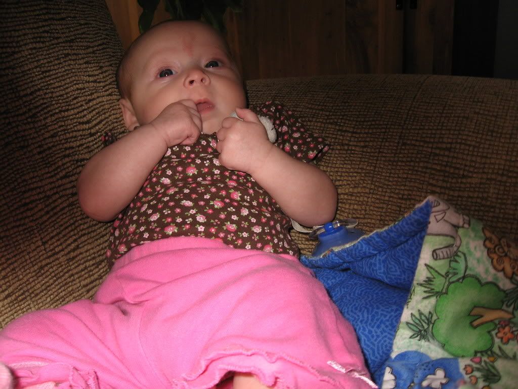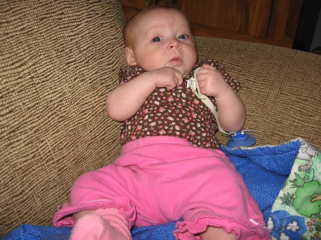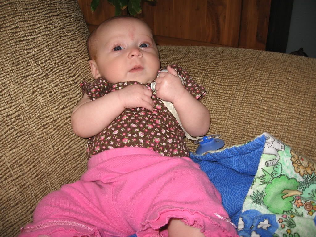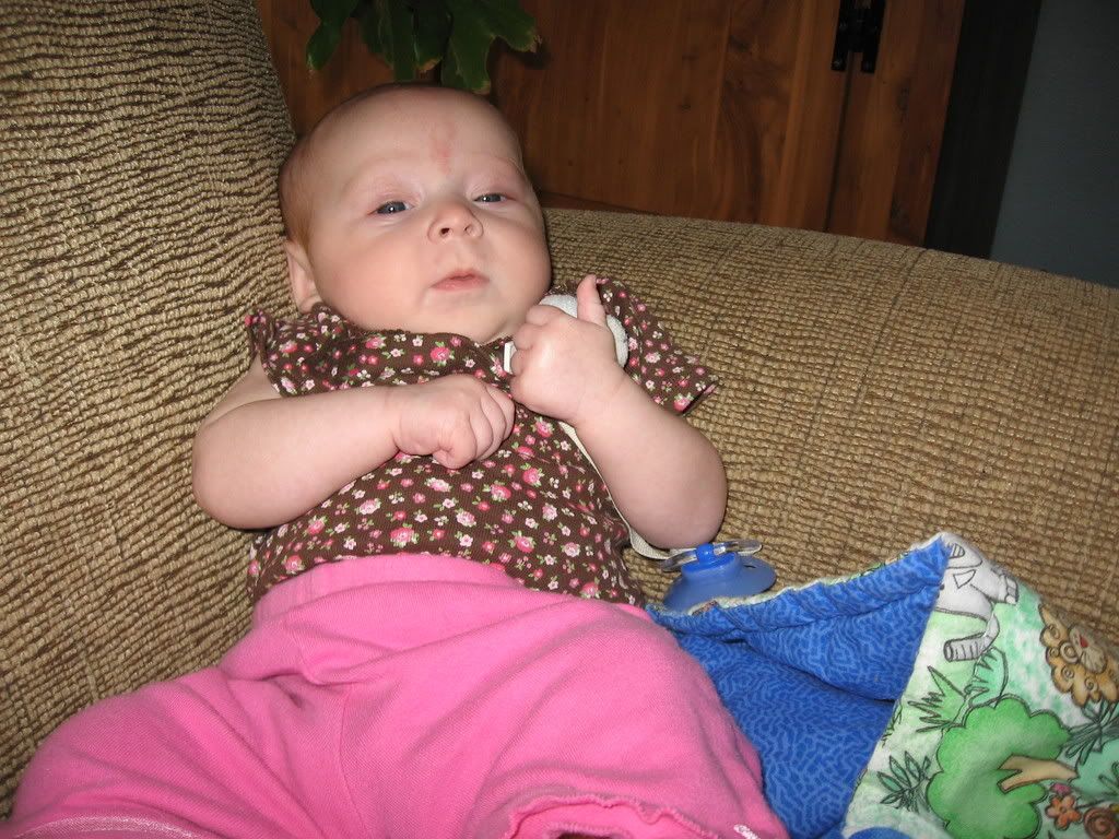 She is starting to sit up so here is she with Austin "sitting" on the couch. Sometimes she needs a bit of help....