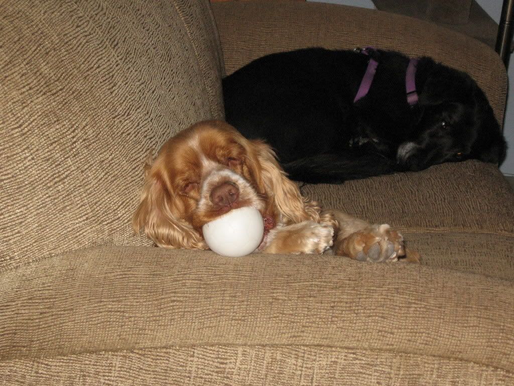 Here is Joey, my In-laws Cocker. He loves the ball. Loves it soo much here he is, asleep with the ball in his mouth, ready to play.